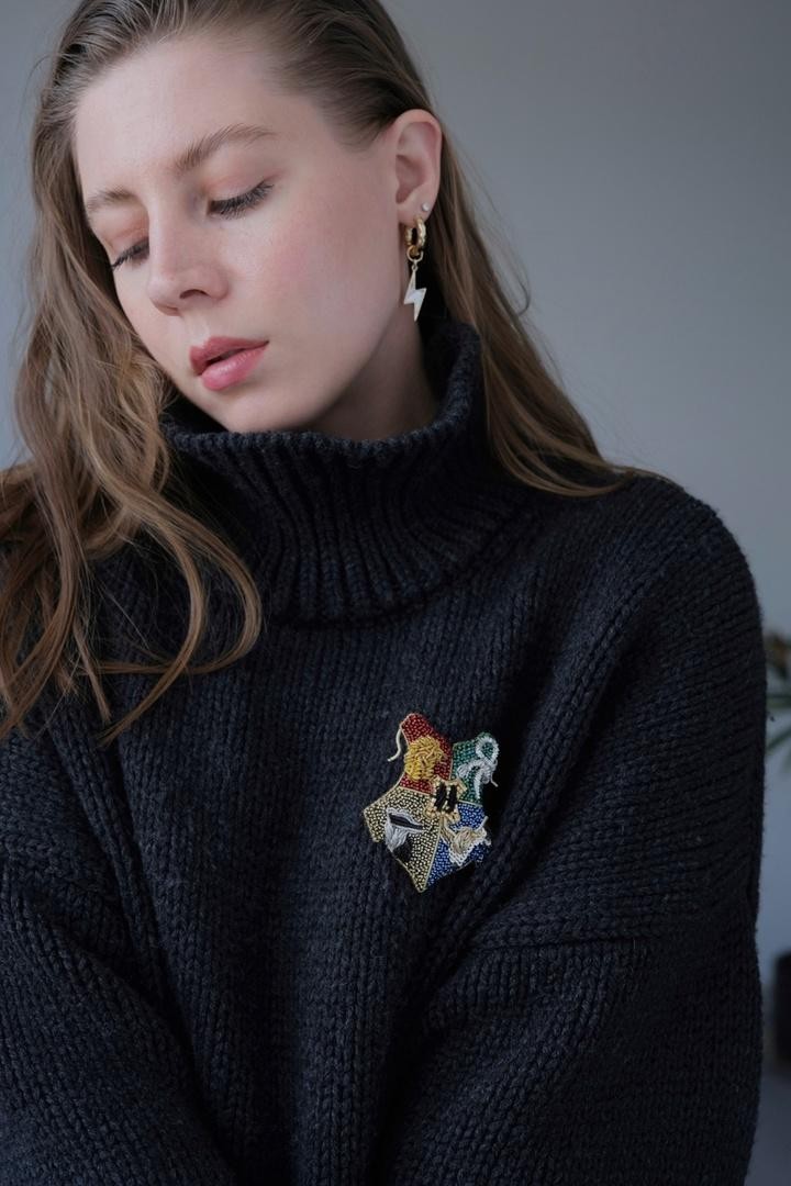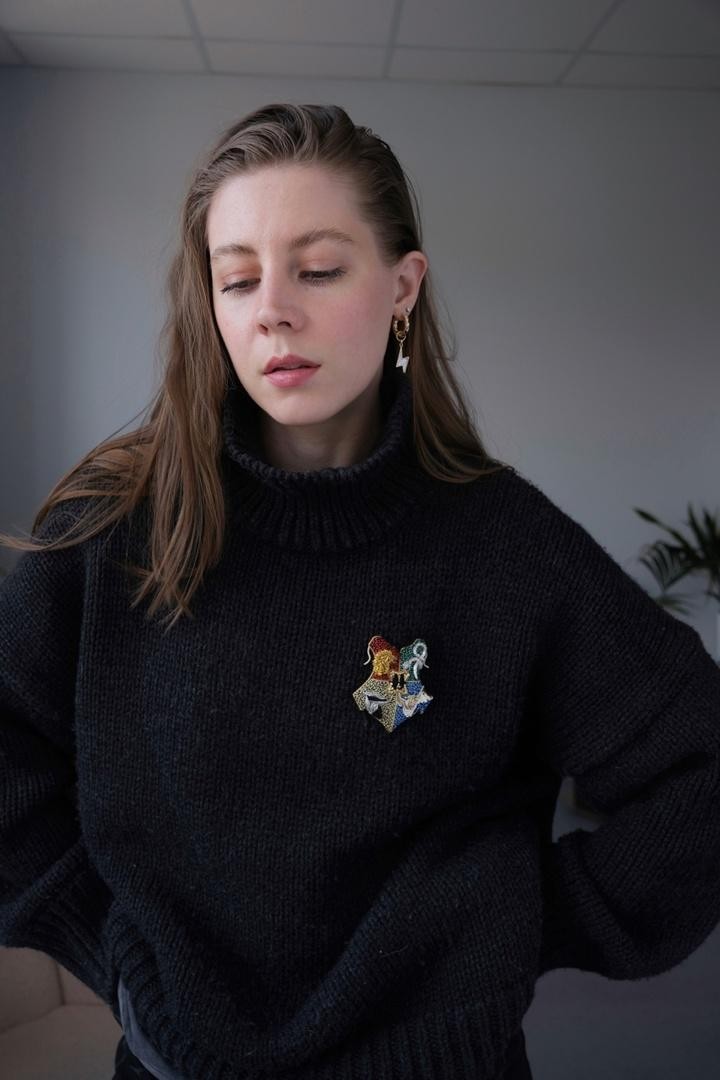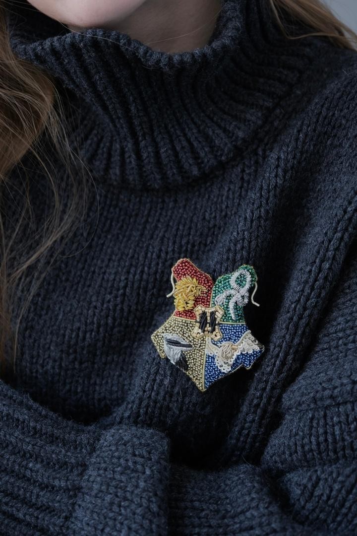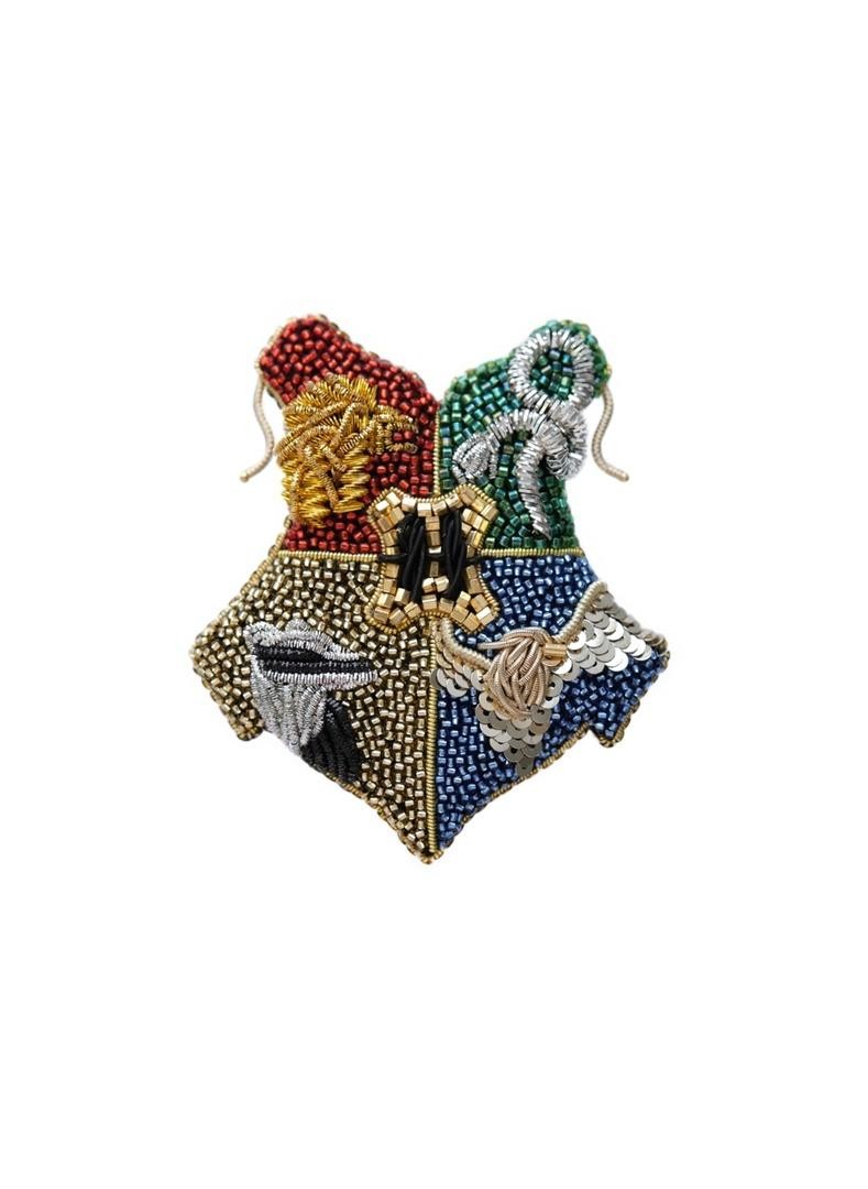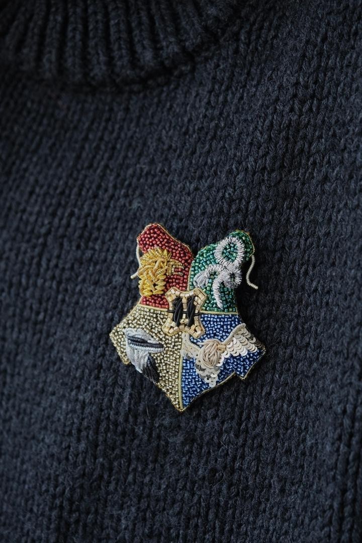 Брошь в виде герба школы чародейства и волшебства Хогвартс, вышитый из японского ювелирного бисера, итальянских пайеток и индийской канители. На котором изображены символы каждого факультета.