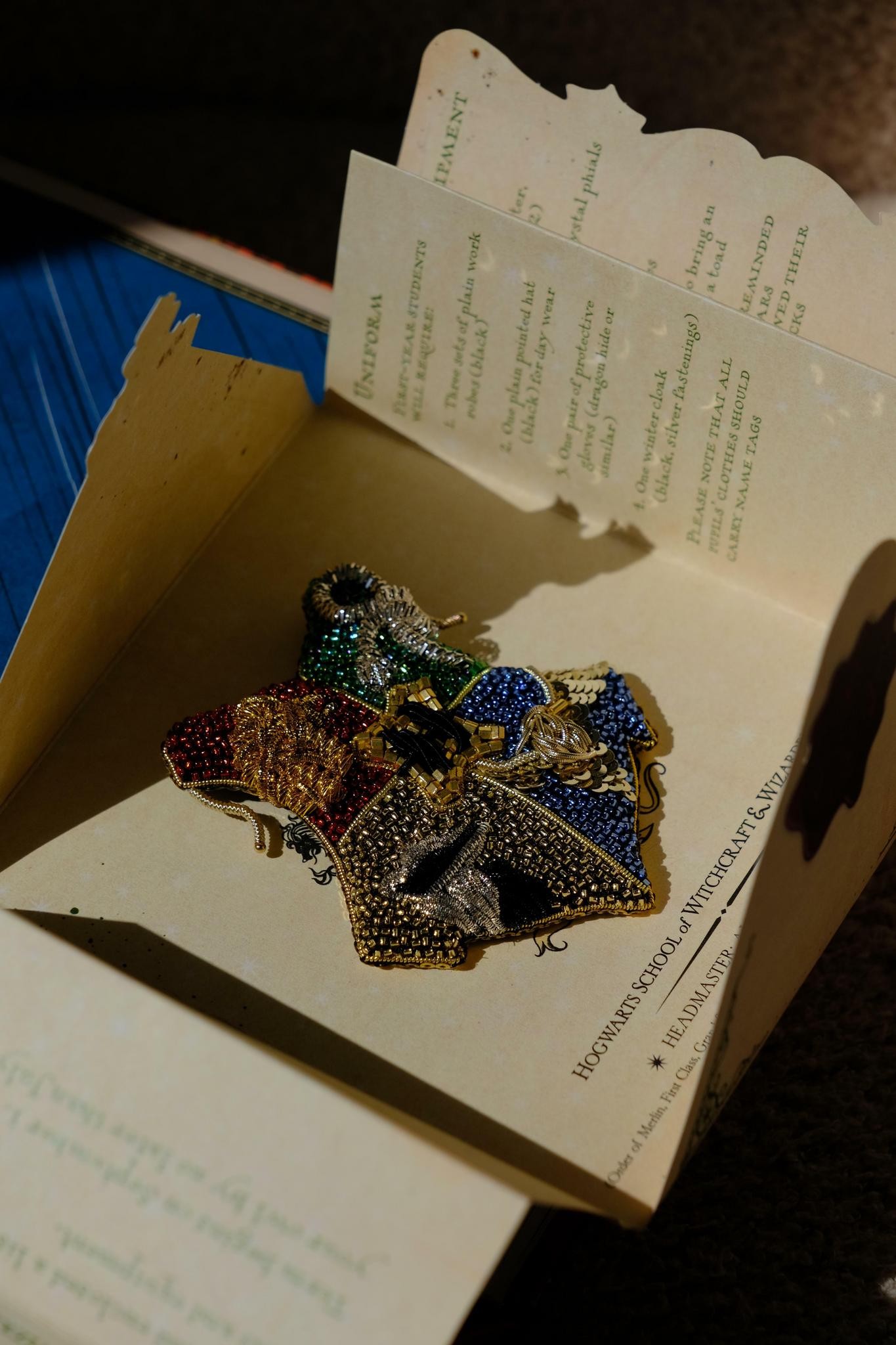 Брошь в виде герба школы чародейства и волшебства Хогвартс, вышитый из японского ювелирного бисера, итальянских пайеток и индийской канители. На котором изображены символы каждого факультета.