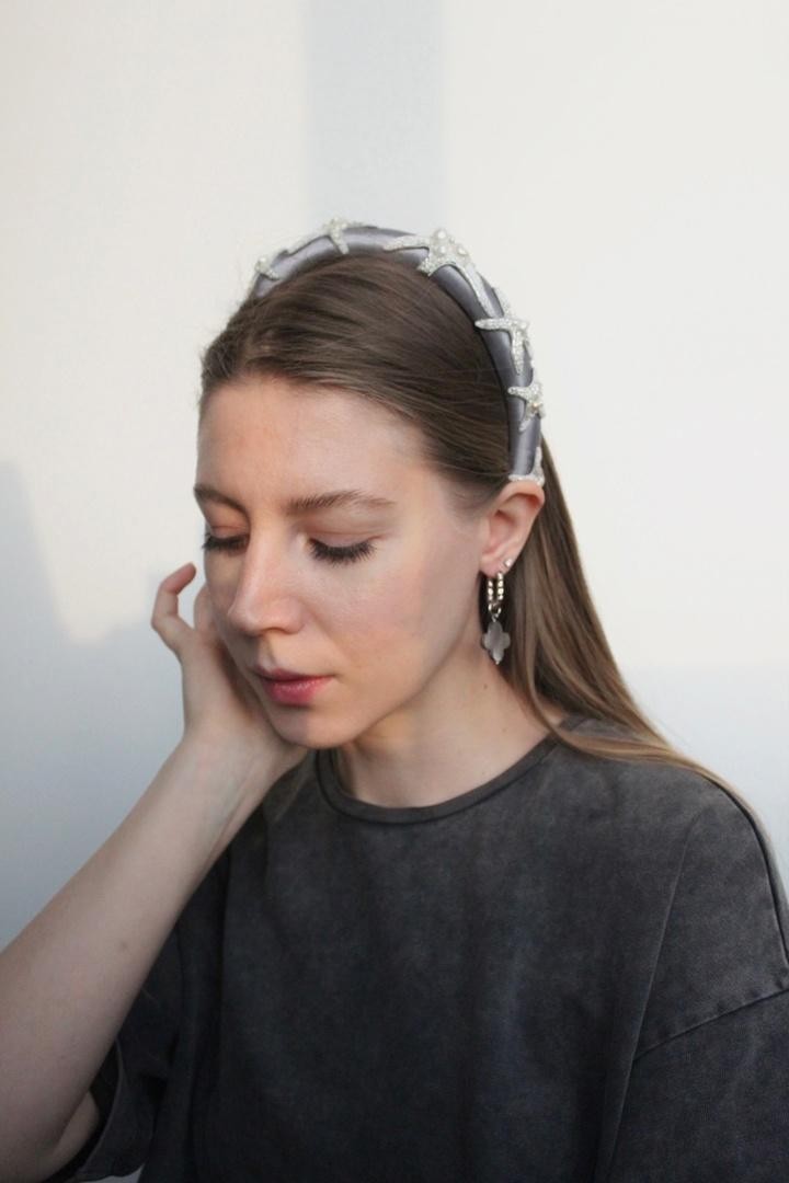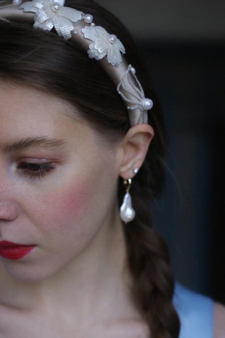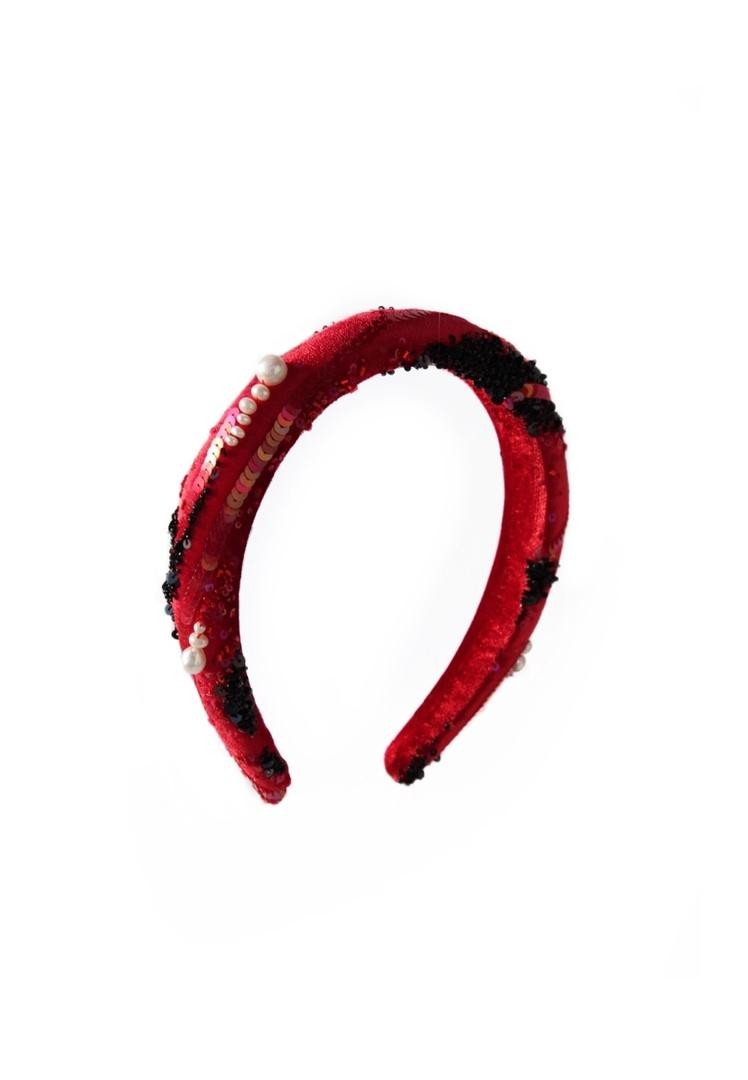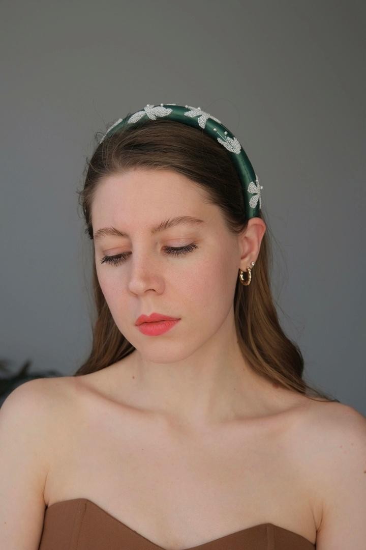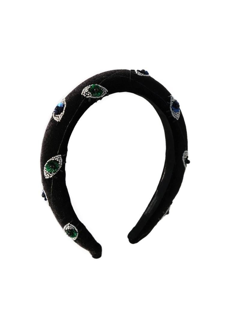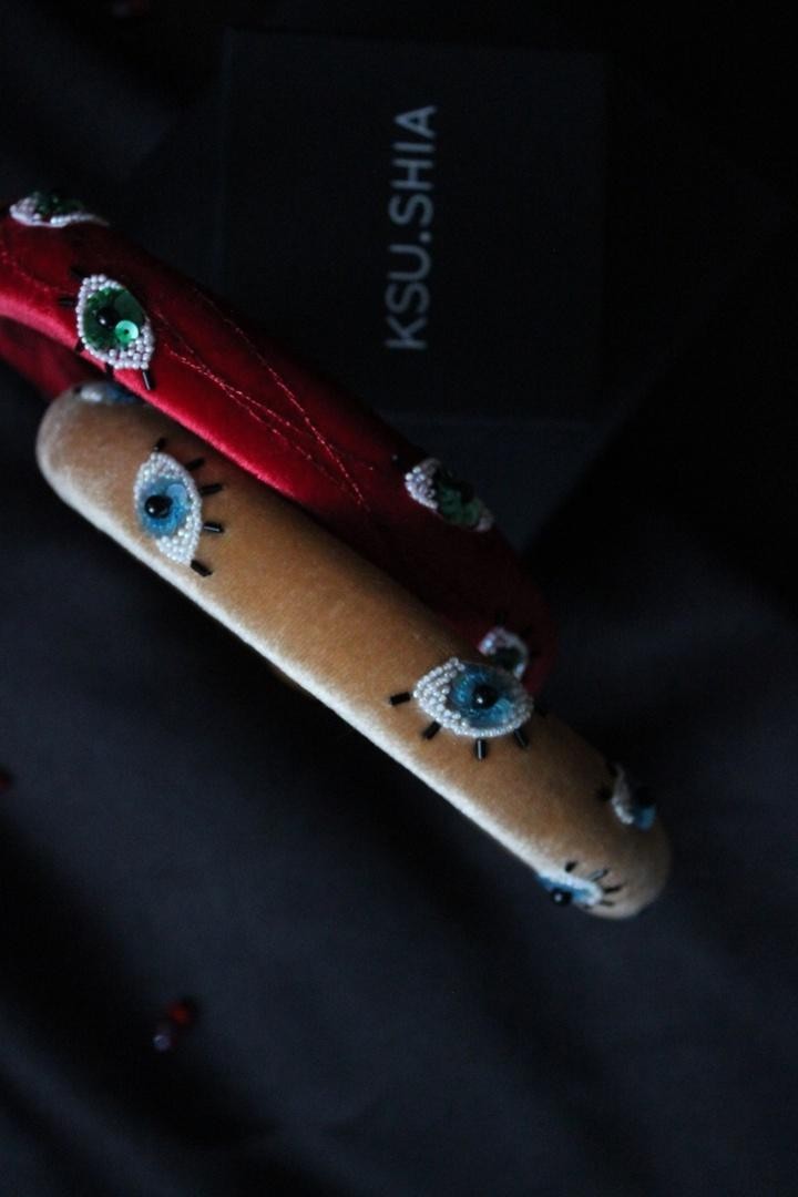 Необычный ободок с вышивкой японским ювелирным бисером, итальянскими пайетками и жемчужинами Swarovski на бархате Ширина ободка 2 см, высота 1,7см. Чтобы выбрать определённый цвет пайеток для зрачков, напишите нам об этом в комментарии к заказу.