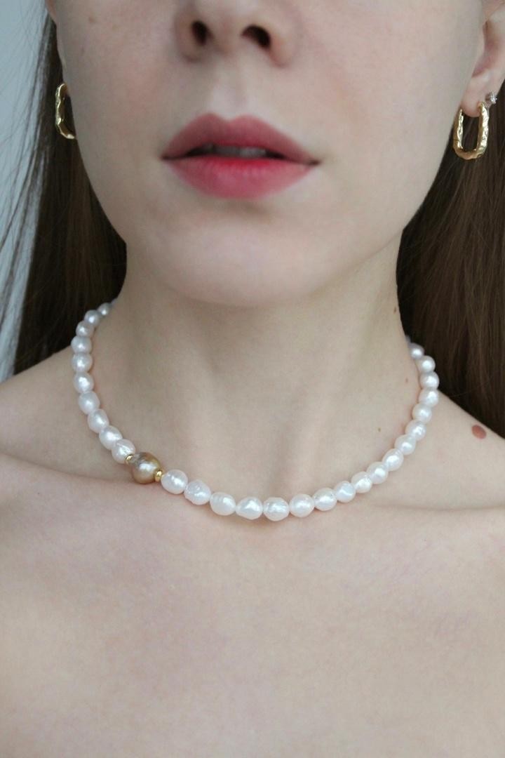 Колье из натурального белого жемчуга с акцентной золотой жемчужиной. Колье можно носить разными сторонами, цепочкой вперед, а также надевать на карабин съёмные подвески. Длина 39-45см<br /><br />При необходимости скорректировать длину, пожалуйста, напишите об этом в комментарии к заказу! Мы соберём чокер необходимого для вас размера бесплатно (бесплатное увеличение длины до 5см)