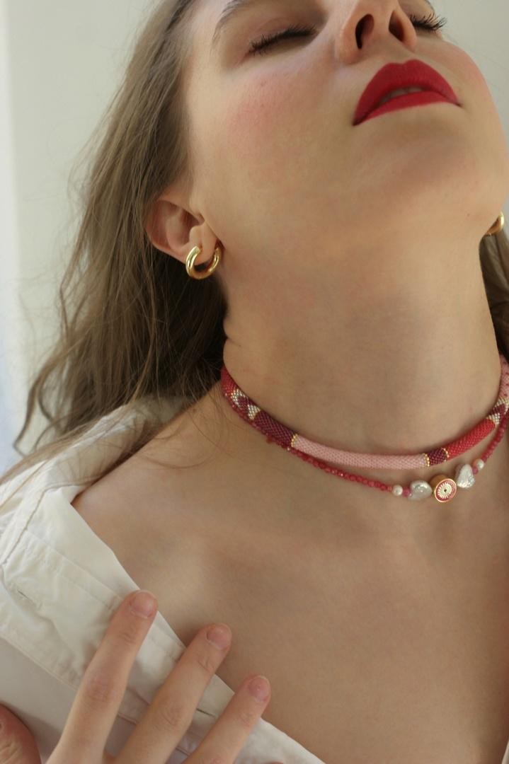 Чокер бисерный жгут в розовых цветах с узором. Толщина 6мм, длина 36-41см<br /><br />При необходимости скорректировать длину, пожалуйста, напишите об этом в комментарии к заказу! И мы соберём чокер необходимого для вас размера (увеличение длины на 2см - бесплатно, каждый последующий +200 руб.)