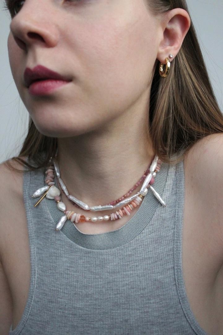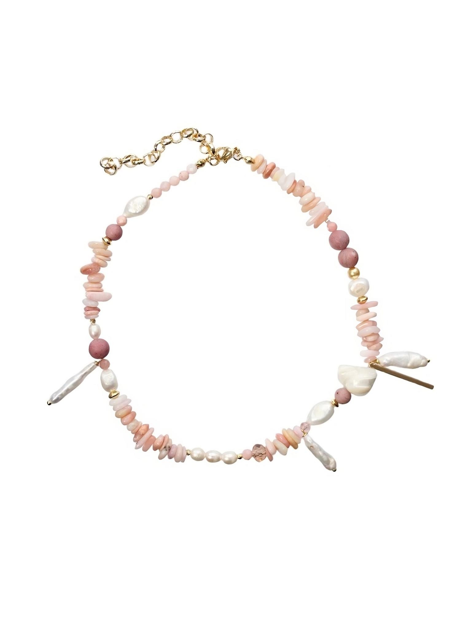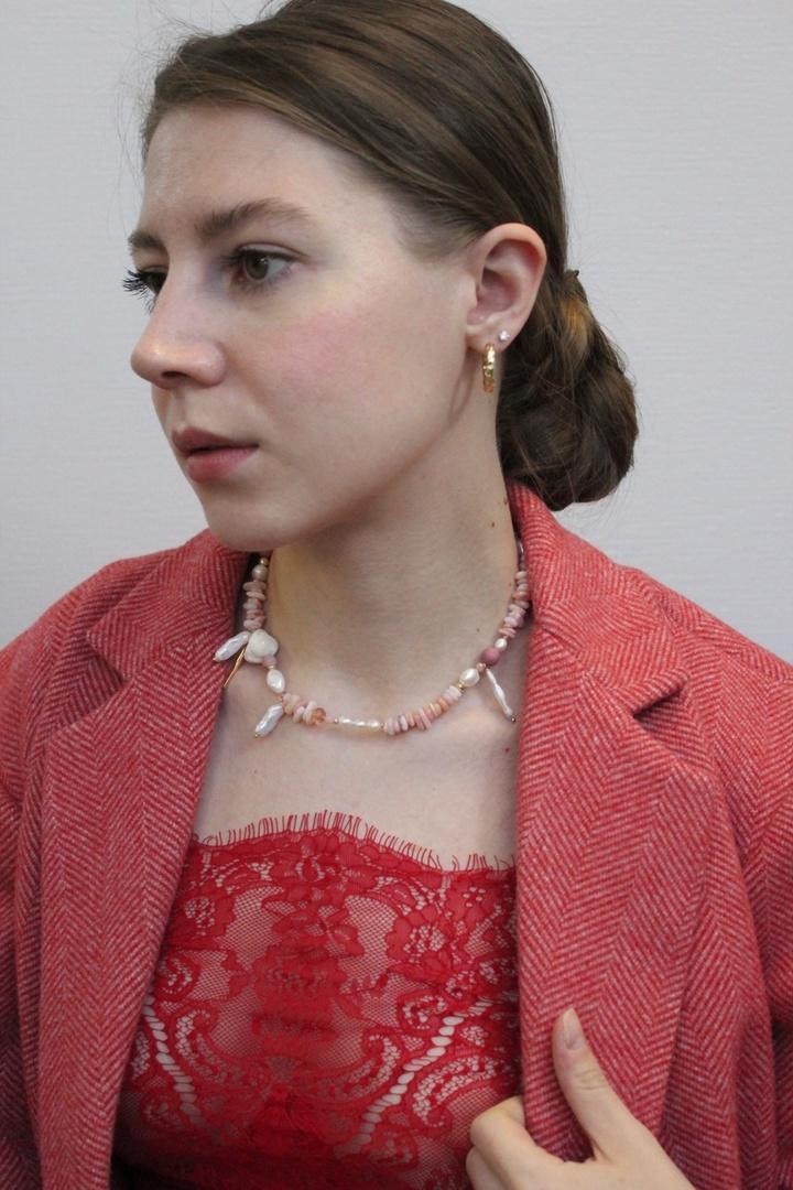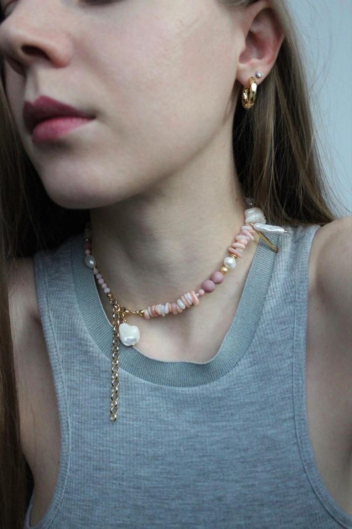 Фактурное колье собрано из натуральных камней (розового опала, родонита, речного жемчуга и перламутра). Колье-трансформер можно носить любой стороной, а также надевать подвески на карабин. Длина 37-44см<br /><br />При необходимости скорректировать длину, пожалуйста, напишите об этом в комментарии к заказу! Мы соберём чокер необходимого для вас размера бесплатно (бесплатное увеличение длины до 5см)