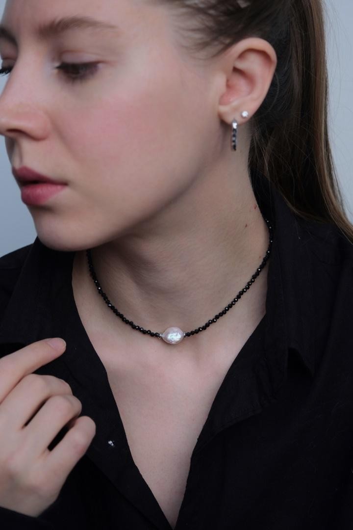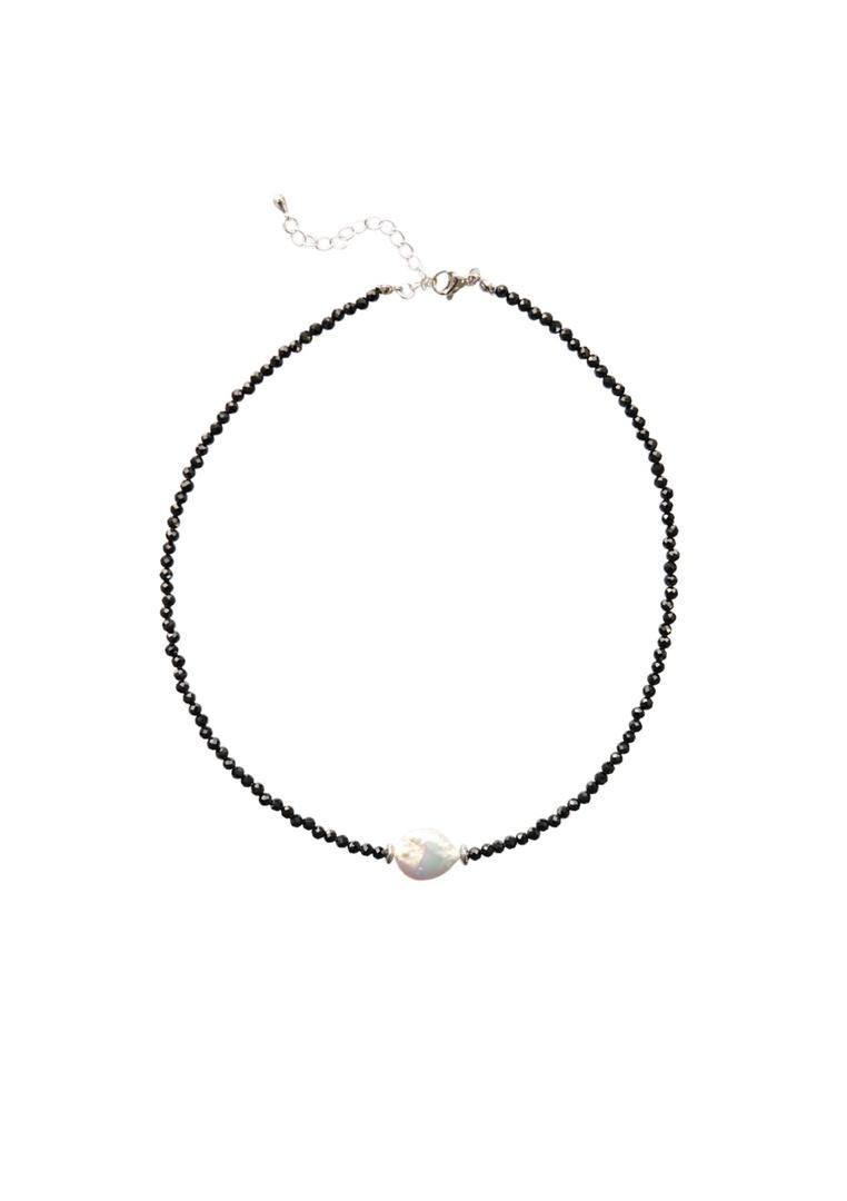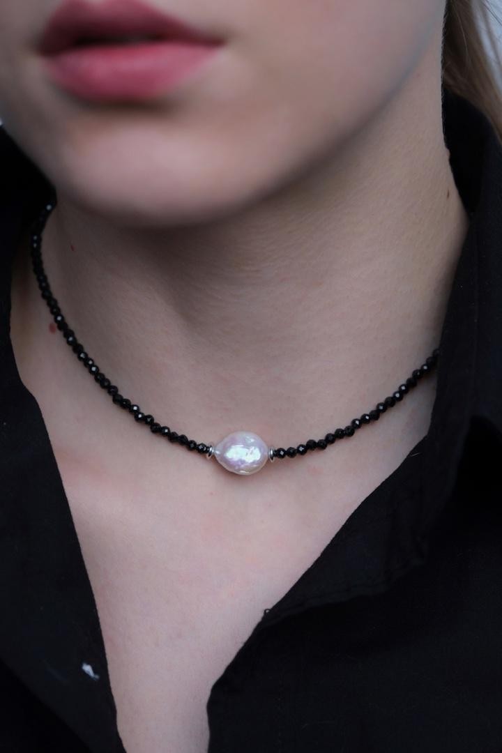 Чокер собран из чёрной шпинели с акцентной жемчужиной, длина 36-41см<br /><br />При необходимости скорректировать длину, пожалуйста, напишите об этом в комментарии к заказу! Мы соберём чокер необходимого для вас размера бесплатно (бесплатное увеличение длины до 10см)