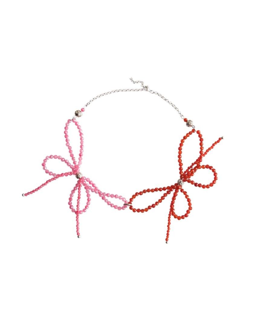 Чокер собран из сверкающих розовых фианитов и красного сердолика в форме двух переплетённых бантов, длина 36-42см<br /><br />При необходимости скорректировать длину, пожалуйста, напишите об этом в комментарии к заказу! Мы соберём чокер необходимого для вас размера бесплатно (бесплатное увеличение длины цепочки)