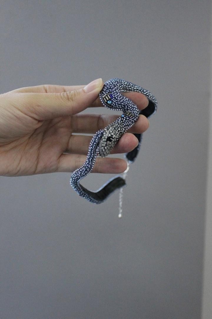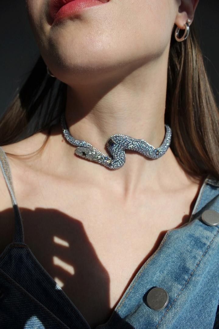 Невероятный чокер в виде змеи, обвивающей шею с вышивкой из японского ювелирного бисера и камней Swarovski, длина 34-40 см. Под заказ возможно изготовление по индивидуальным меркам.