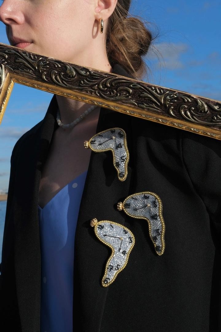 Брошь, вдохновлённая известной картиной Сальвадора Дали "Постоянство памяти", выполненная из вышивки японским сияющим бисером
